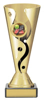 Carnival cups present a distinctive cup style trophy with attractive 3D design - on classic black marble base for your engraving - with brightly coloured insert for your sport. Trophies adaptable to your custom requirements.