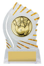 Exciting design of acrylic trophy showcases the gold theme for your sport or trophy. An affordable award with terrific space for your engraving.